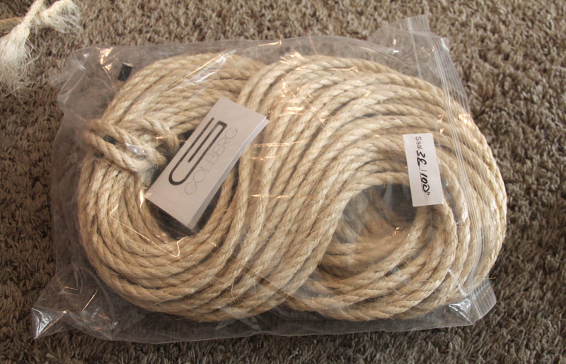 You need sisal rope. Same rope that is used on all cat trees. We bought 3/8 and 100 feet on Amazon. Thick and long enough.